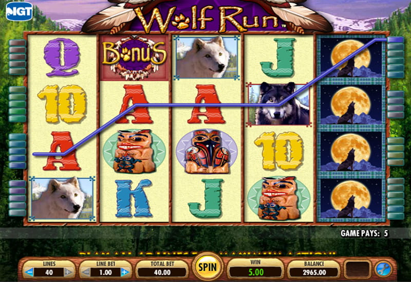 This video slot has 5 reels, 4 rows and 40 selectable paylines. You can adjust the number of paylines to suit your preference, with the option to enable 1, 5, 10, 20, 30 or all 40 paylines. Of course, you’ll get the maximum action playing with all lines enabled. IGT first created this slot for land based casinos, and the online version perfectly mirrors the successful original game. Set in the American mountains, there is an abundance of native American imagery included, such as totem pole symbols. Also, as you would expect, there are lots of wolves featured in the game. The howling wolf in front of the full moon provides the highest payout of 1000x for 5 on an active payline. This symbol is wild, and substitutes for all others except the bonus symbol. What’s more, the stacked wild feature sees 4 or more of these symbols stacked together on the reels, providing good chances of lining up wins.